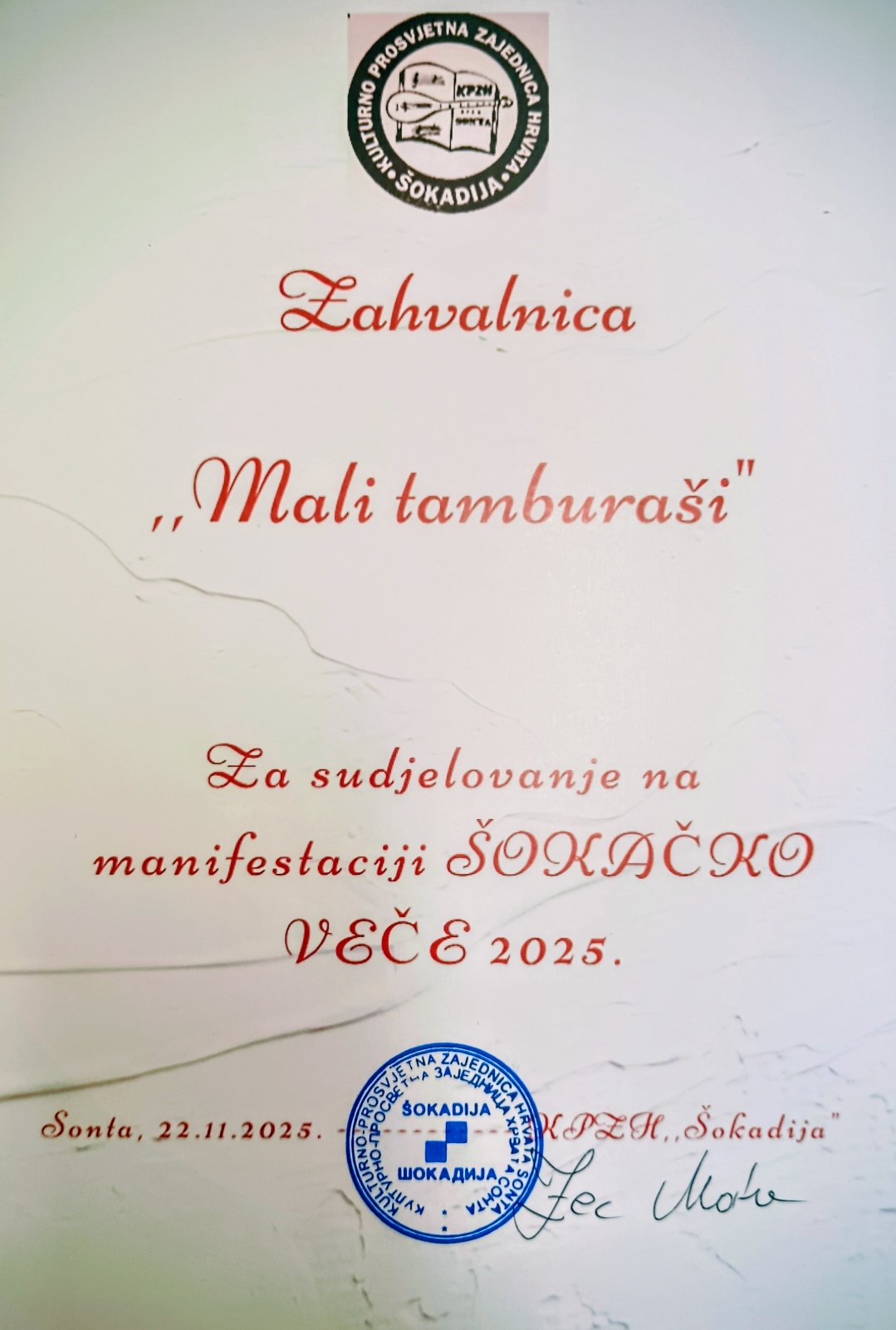 Ученице издвојеног одељења у Сонти, Милица Петровић и Луција Декан, које похађају наставу тамбуре у класи наставника Давида Антунића, успешно су наступиле на програму одржаном у склопу манифестације Шокачко вече 2025.